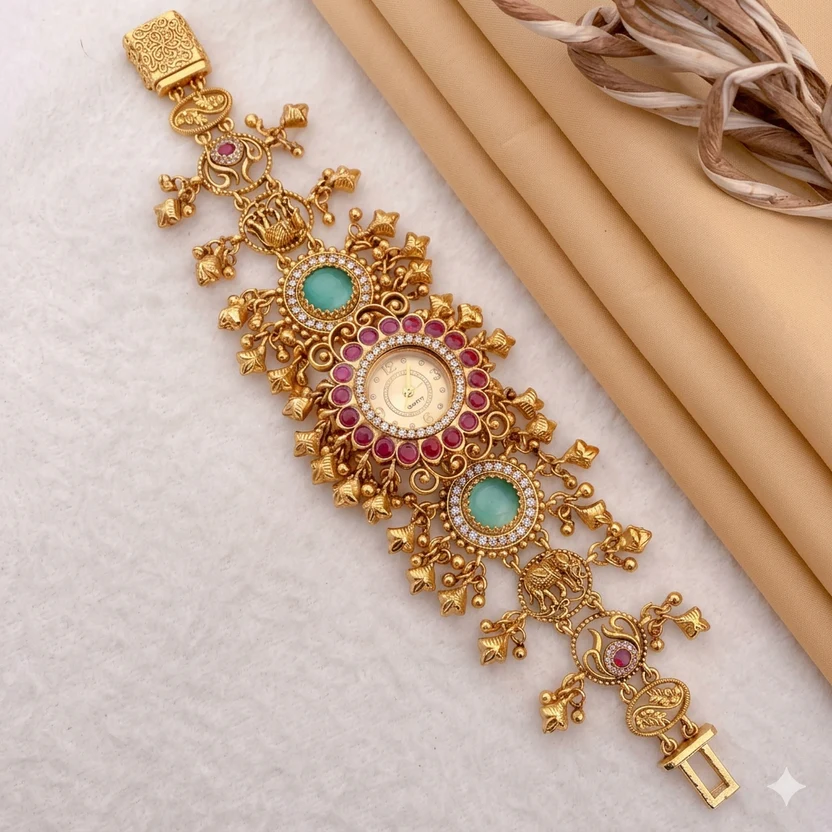 Presenting the Royal Elephant Motif Kashmiri Bridal Watch, a luxurious traditional ladies wristwatch inspired by classic Kashmiri heritage jewelry. This heavy antique gold watch features beautifully detailed elephant motifs, intricate handcrafted patterns, and elegant hanging ghungroo-style elements that create a bold and majestic bridal appearance.