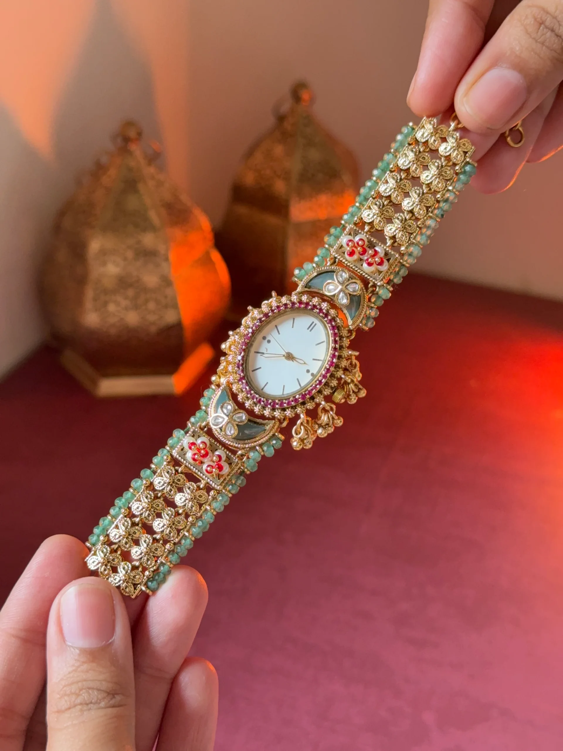 The watch features a delicate round dial surrounded by sparkling stone detailing, creating a luxurious and eye-catching look. The bracelet band is decorated with intricate gold-tone patterns, colorful stones, and elegant beadwork, giving it a rich ethnic appeal that pairs perfectly with traditional and festive outfits.