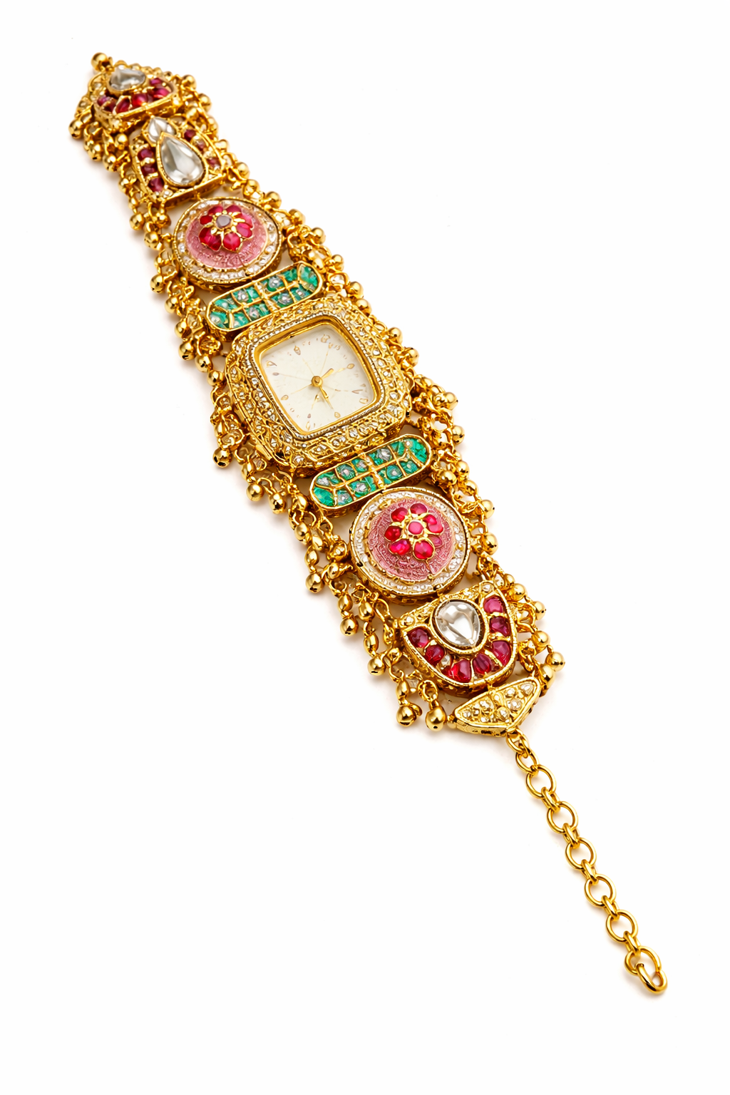 Add royal elegance to your collection with this Luxury Kashmiri Designer Bracelet Watch. Inspired by traditional Kashmiri jewelry, this watch features beautiful kundan stones, colorful enamel detailing, and a premium gold finish that creates a stunning ethnic look.