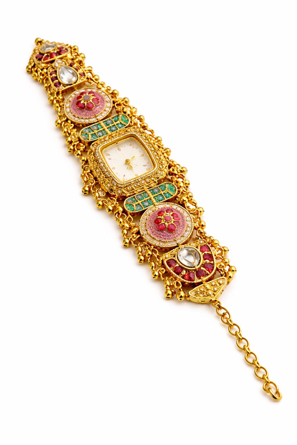 Enhance your style with this Luxury Kashmiri Kundan Bracelet Watch for Women, inspired by traditional Kashmiri craftsmanship. This elegant watch features intricate gold detailing, colorful stones, and royal kundan work that makes it look like a premium jewelry bracelet.
