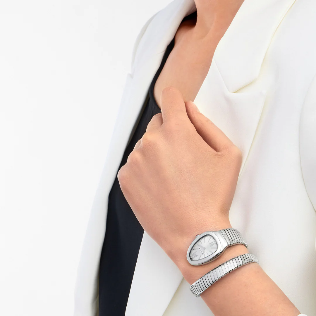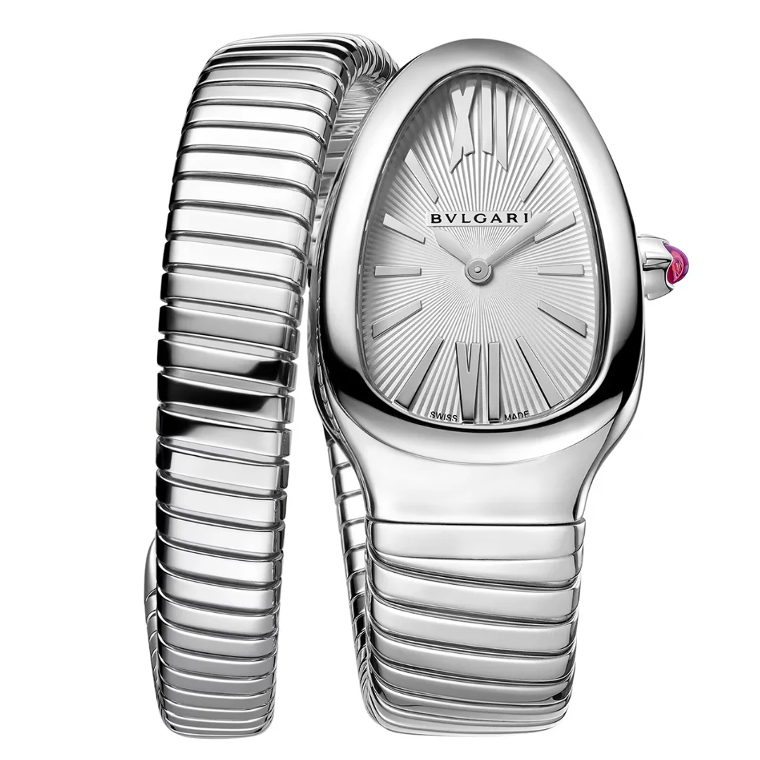 Merging two of the most iconic symbols of Bulgari design, the Serpenti Tubogas watch coils the sinuosity of the snake with the contemporary soul of tubogas. Evoking both the sensual curves of a woman and the fluid shape of the serpent, the timepiece is crafted with the shapely lines of this specific technique, with a flexible and tubular litheness. Radiating glamour and a truly individual style, this watch marks a distinctive chapter in the constant evolution of Serpenti. Serpenti Tubogas watch with quartz movement, 35 mm stainless steel curved case, stainless steel crown set with a cabochon cut pink rubellite, silver opaline dial with guilloché soleil treatment and hand-applied indexes, single spiral stainless steel bracelet.